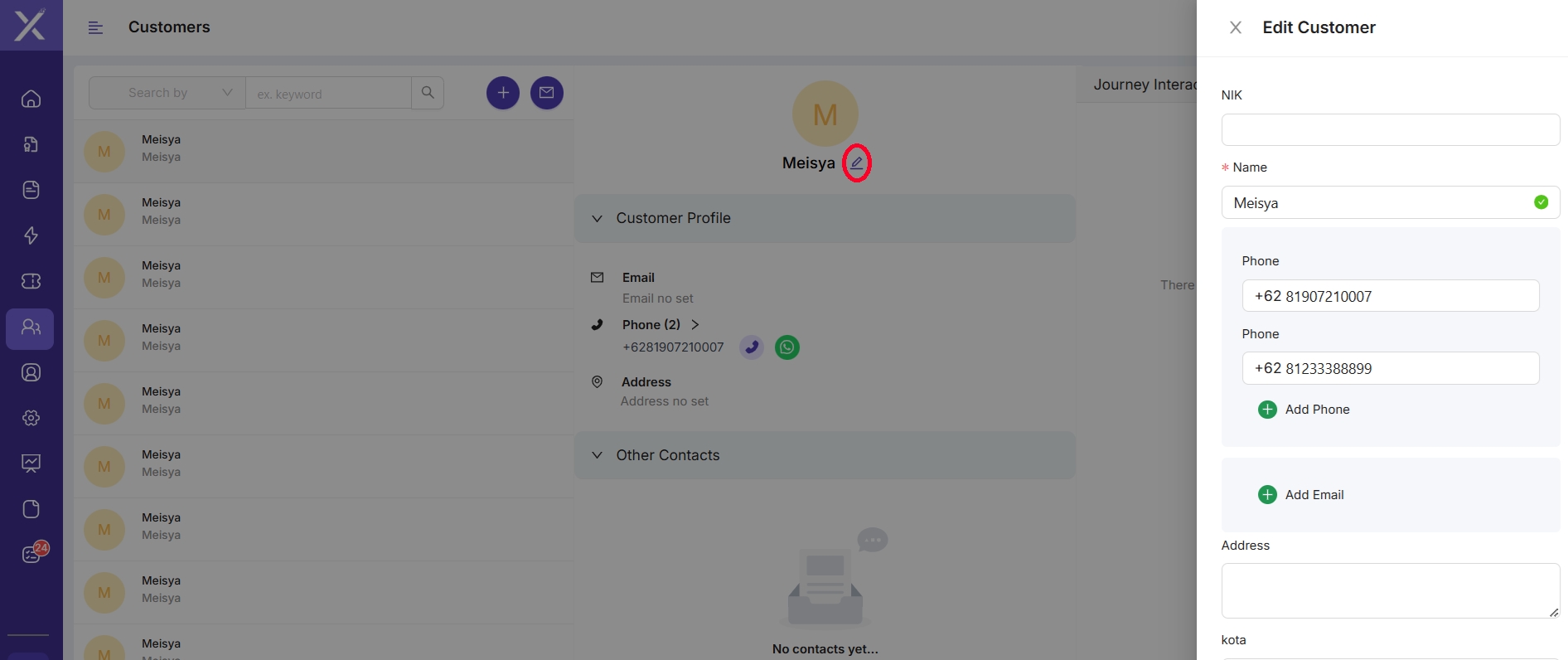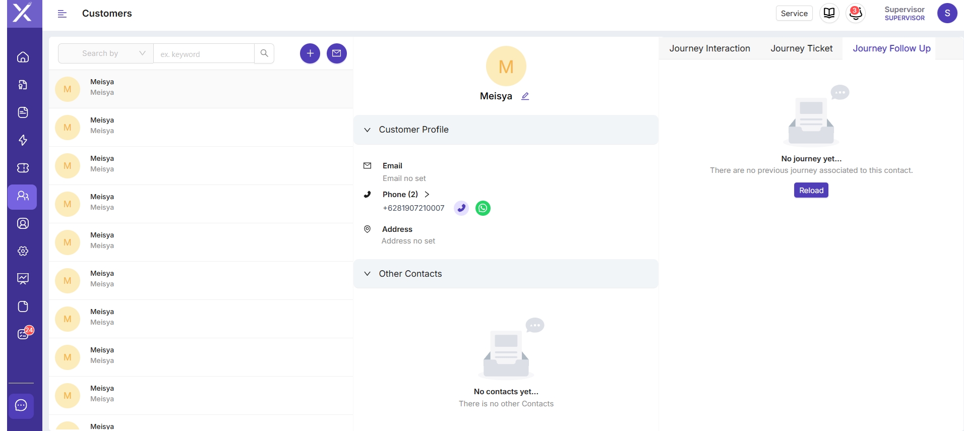Jika Supervisor mengklik salah satu customer yang berada di list, maka akan muncul tampilan seperti berikut. Untuk melihat history interaksi dari customer, Supervisor dapat melihat nya melalui Journey Interaction, Journey Ticket dan Journey Follow Up yang terletak pada pojok kanan atas menu.