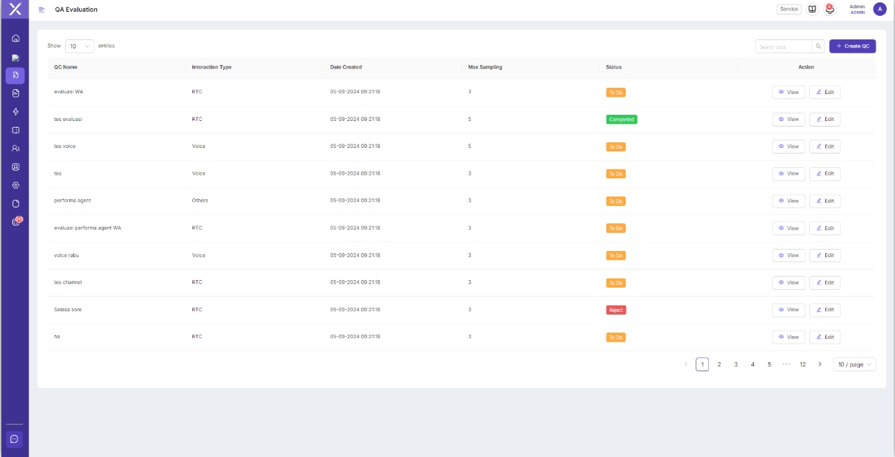 Contoh evaluasi dengan status yang telah berubah dapat ditemukan pada fitur QA (Quality Assessment) Evaluation, yang tersedia bagi pengguna dengan peran Supervisor dan Admin. Fitur ini digunakan untuk memberikan penilaian terhadap performa Agent berdasarkan kriteria yang telah ditetapkan dalam template evaluasi.