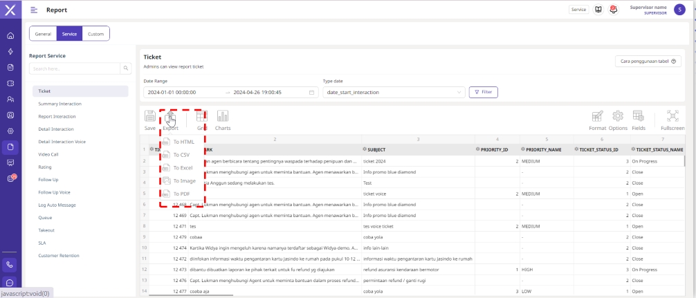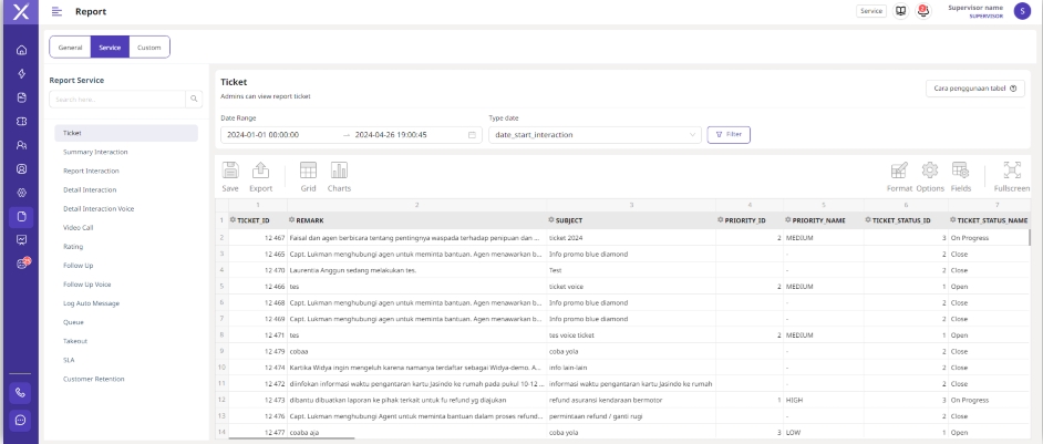 Dalam menu ini, Supervisor dapat melihat hasil laporan interaksi dan tiket yang telah dibuat.