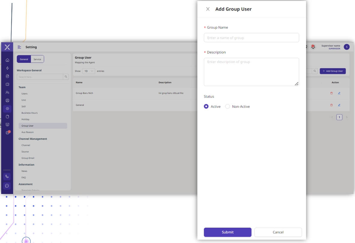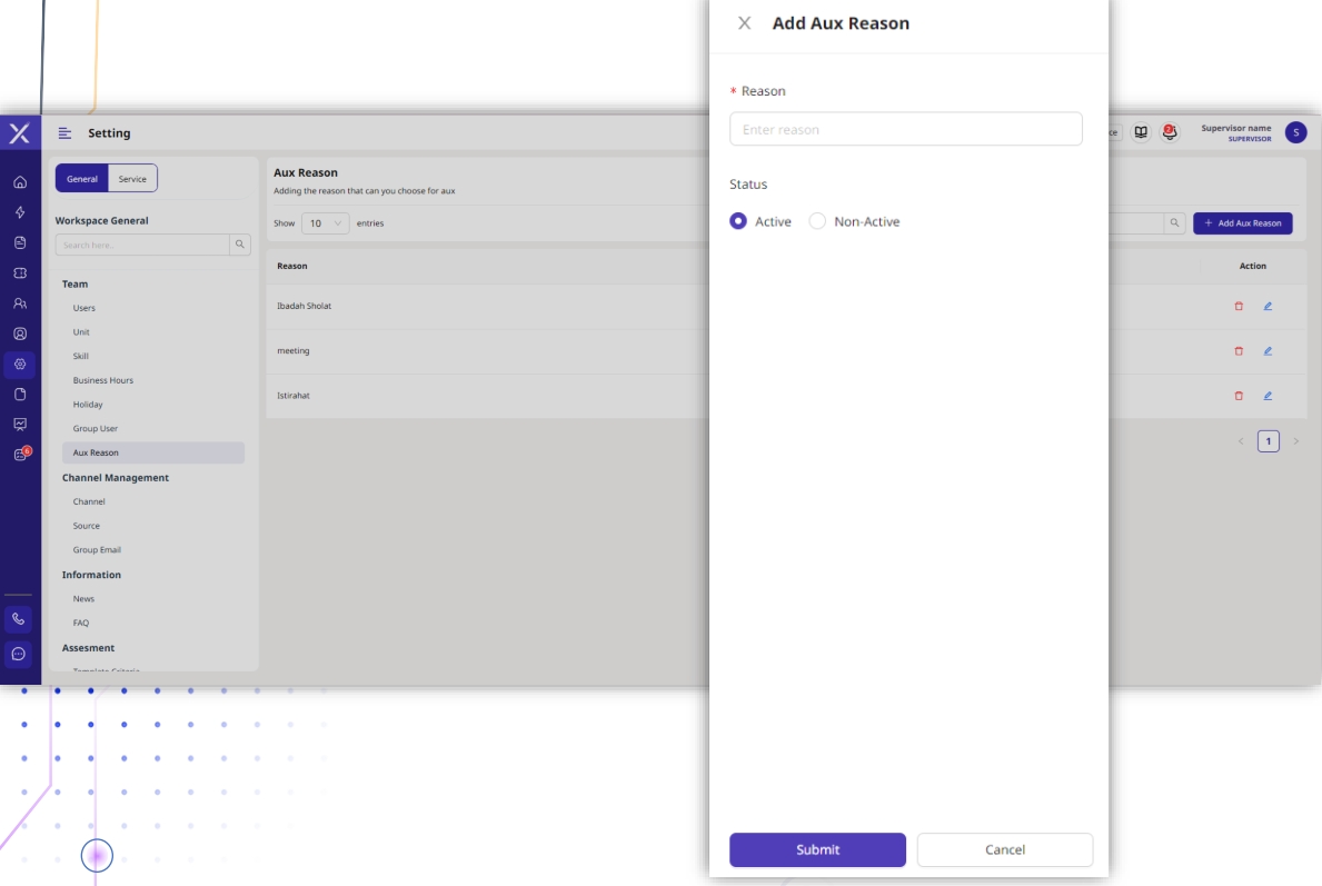 Untuk membuat Aux reason, Supervisor perlu memasukan nama reason dan memilih status reason.