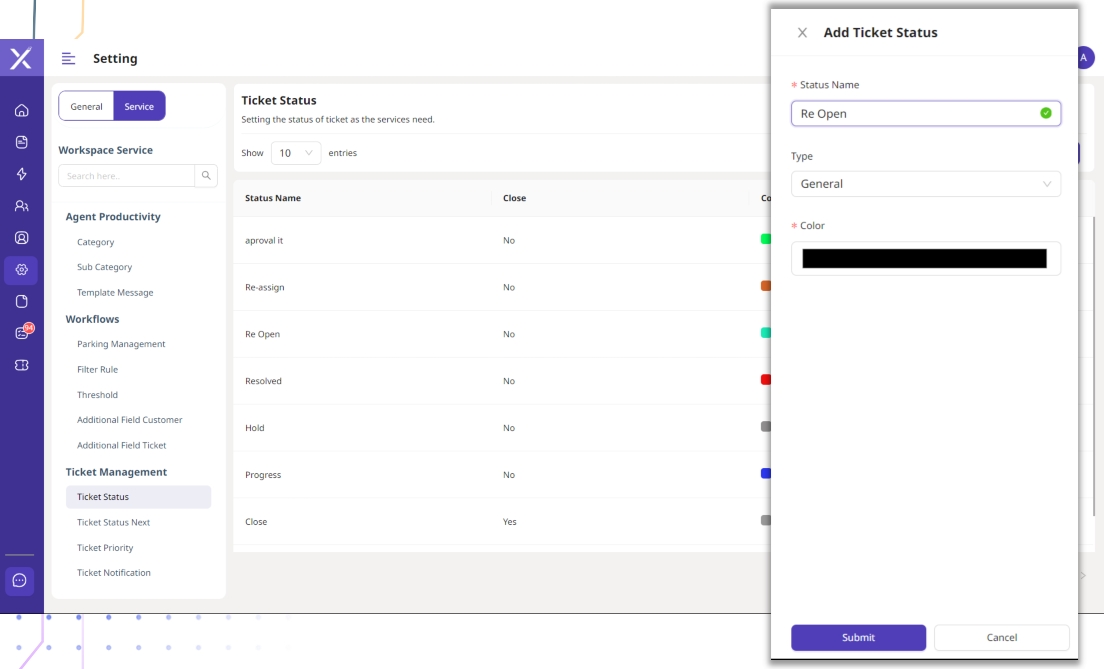 Untuk membuat status tiket, user dapat klik "Add Ticket Status" dan isikan form yang ditampilkan.