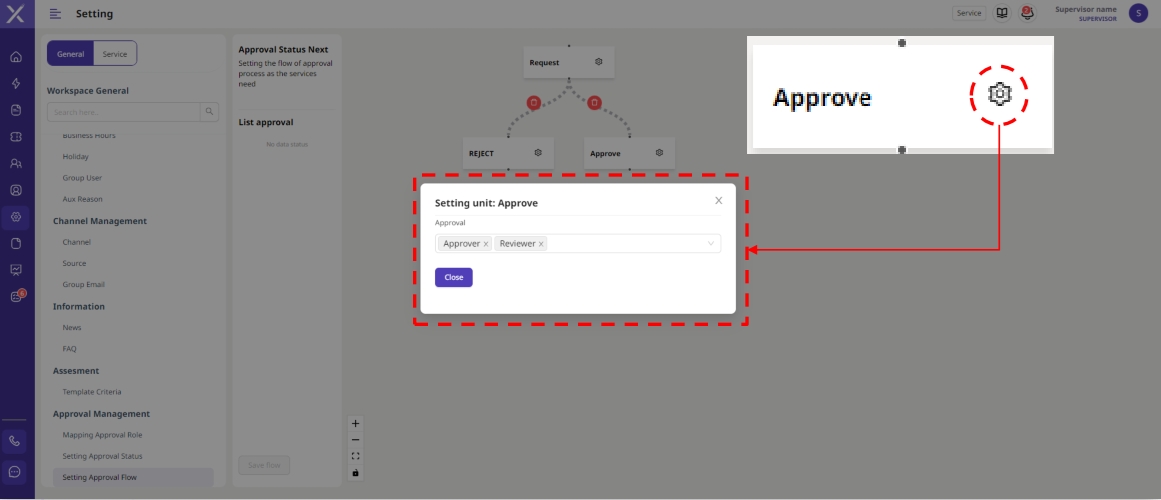 Untuk membuat flow approval status, cukup tarik status yang ada pada panel approval list ke panel flow approval status. Hubungkan status yang satu dengan yang lainnya sesuai flow yang diinginkan, dengan menarik titik yang berada di bagian atas dan bawah kotak status. Setelah selesai di buat flow klik " Save Flow" yang berada di bagian bawah sebelah kiri untuk menyimpannya.