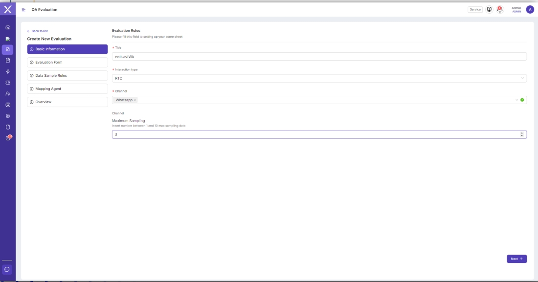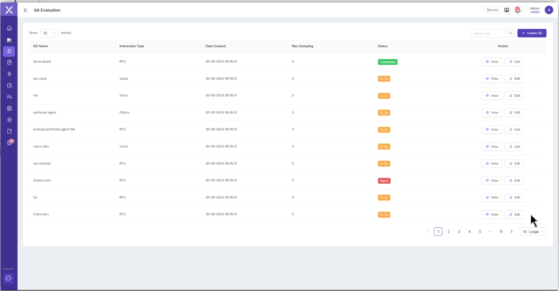 Setelah membuat template criteria, kemudian masuk ke menu QA Evaluation untuk management evaluasi. Setiap evaluasi yang dibuat dapat diatur channel apa saja yang ingin dievaluasi, jumlah maximal sampling, template yang digunakan untuk evaluasi, kriteria tematik evaluasi dan Agent yang ingin dievaluasi. Pilih "Create QC" di pojok kanan atas untuk membuat Evaluation.