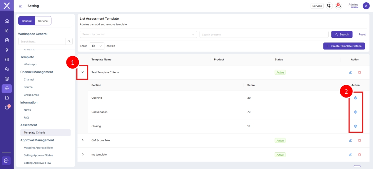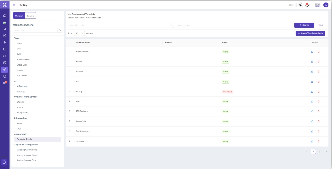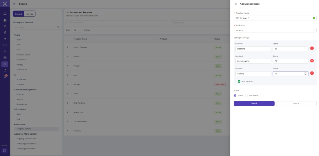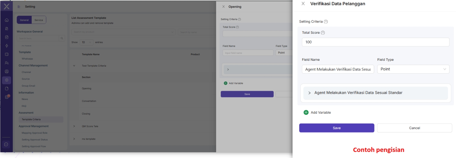 Untuk membuat Quality Assesment harus dibuat dulu Tempalate Criteria yang terdapat di menu Setting. Fitur ini berfungsi untuk memberikan skor pada performa Agent dalam menghandle interaksi dengan customer berdasarkan kriteria template yang telah dibuat.
