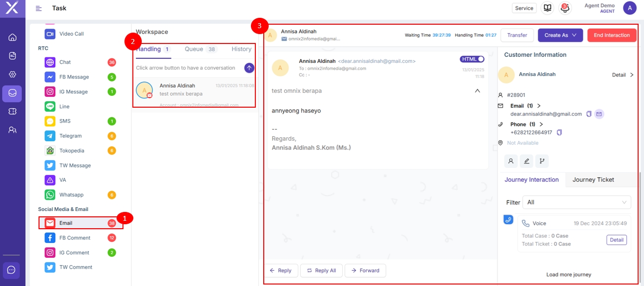maka secara otomatis jumlah interaksi yang ada di kolom Queue akan berkurang dan di kolom Handling akan bertambah. Ketika klik salah satu interaksi yang ada, maka akan muncul tampilan seperti yang berada di sebelah kanan workspace.Dalam tampilan ini, terdapat Waiting Time dan Handling Time, kolom interaksi, informasi customer, journey interaction dan jorney ticket.