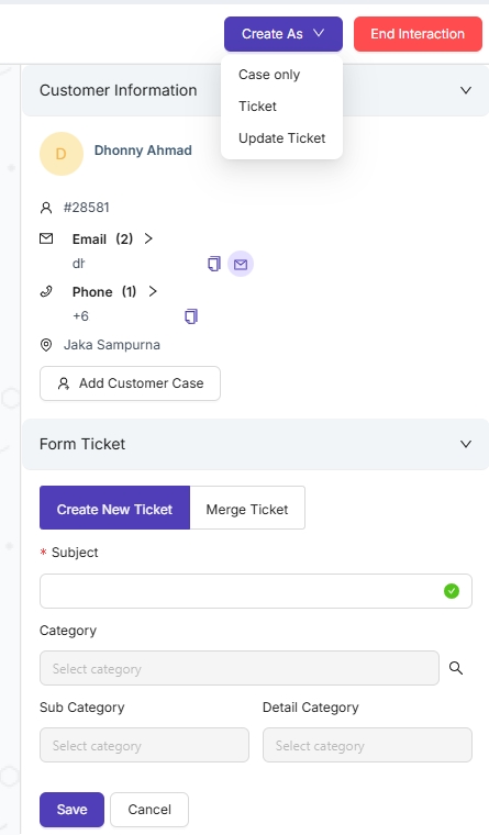 Setiap kali terdapat laporan interaksi yang serupa dengan pelanggan lain, Agent dapat menyamakan tiket atau kasus yang sudah ada dengan melakukan merge ticket. Proses ini dilakukan dengan memilih opsi 'Case Only' atau 'Create Ticket', kemudian melakukan merge ticket.