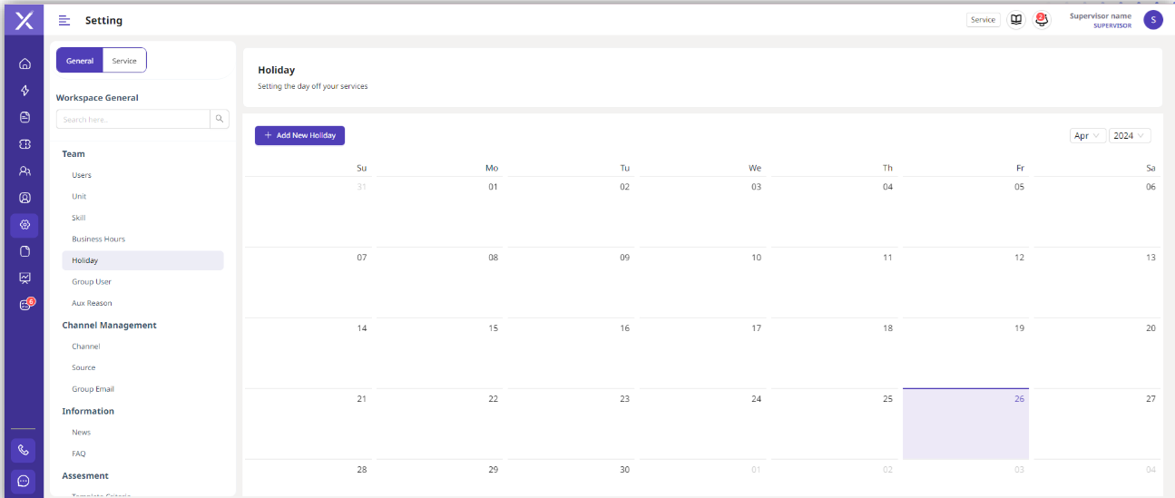 Dalam kolom ini Supervisor dapat membuat jadwal hari libur untuk layanan.