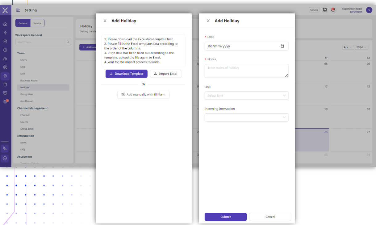 Terdapat dua cara untuk membuat hari libur yaitu dengan import excel ataupun manual. Untuk manual Supervisor perlu mengisikan form yang tersedia yaitu : - Date, diisikan dengan tanggal libur - Notes, jika ada catatan Supervisor dapat menambahkannya - Unit, pilih unit mana yang akan mendapat jadwal libur - Incoming Interaction, merupakan pilihan apakan interaksi akan tetap masuk atau dialihkan ke takeout