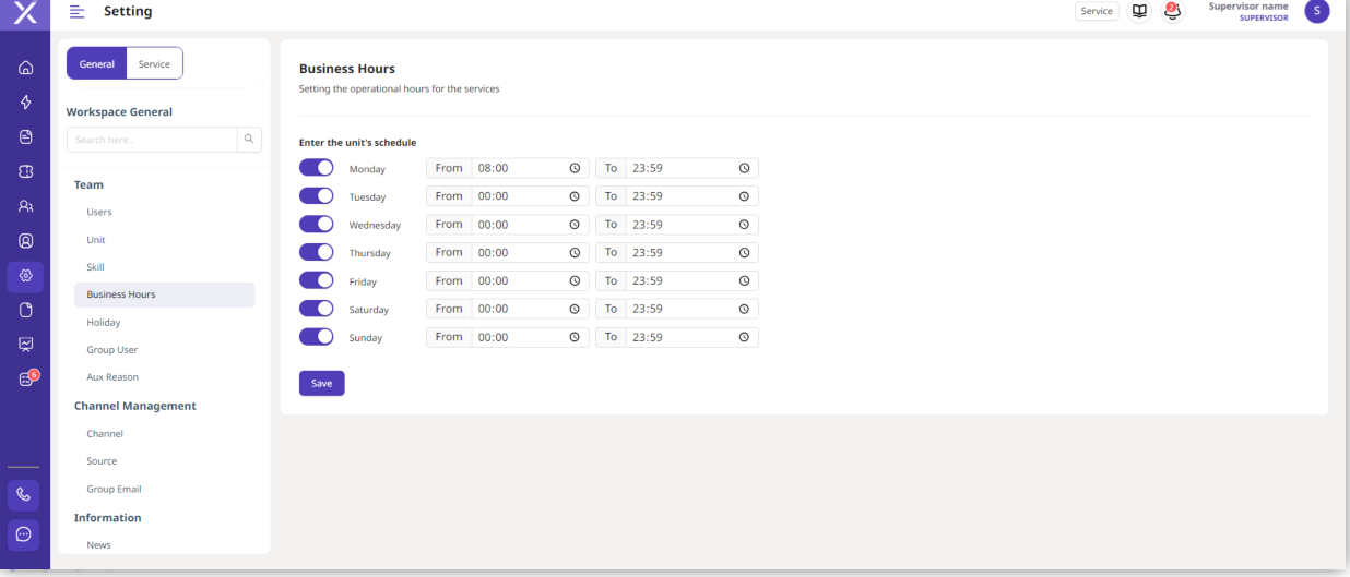 Dalam kolom ini Supervisor dapat membuat hari jam kerja layanan sesuai dengan kebutuhan kemudian klik "Save".