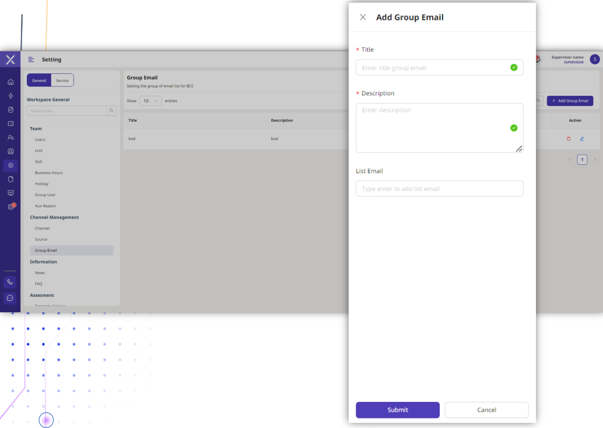 Pada form ini, Title merupakan nama judul atau grup yang daat dipilih oleh Agent, Description merupakan detail penjelasan terkait grup email yang akan di buat, List Email merupakan list untuk mengatur daftar email untuk BCC yang dapat dipilih oleh Agent.