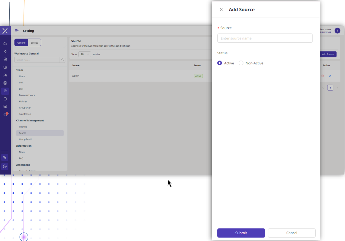 Pada form ini Supervisor perlu mengisi source dan status. Kolom source merupakan nama fungsi untuk menambahkan sumber interaksi manual yang dipilih dan status merupakan status dari source yang akan dibuat.