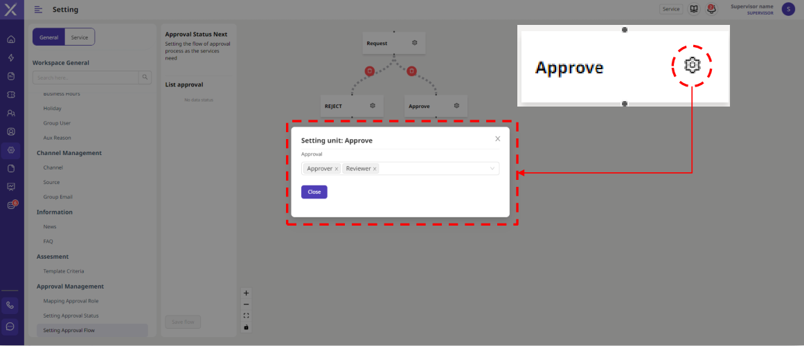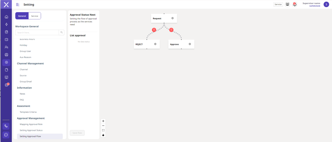 Untuk membuat flow approval status, cukup tarik status yang ada pada panel approval list ke panel flow approval status. Hubungkan status yang satu dengan yang lainnya sesuai flow yang diinginkan, dengan menarik titik yang berada di bagian atas dan bawah kotak status. Setelah selesai di buat flow klik " Save Flow" yang berada di bagian bawah sebelah kiri untuk menyimpannya.
