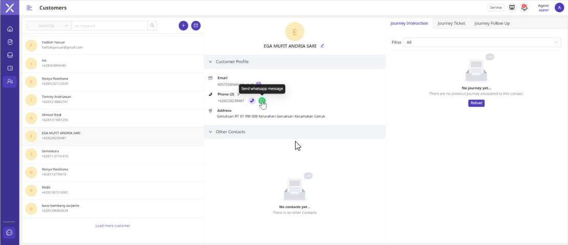 Follow Up merupakan fitur layanan mengirimkan pesan (outgoing) ke customer tanpa menunggu adanya incoming dari customer. Untuk melakukan follow up, cukup mengakses detail dari menu customer, lalu pilih customer yang ingin dihubungi. Pilih ingin melakukan follow up dengan Email, WA, call dan kirim pesan sesuai dengan yang diinginkan.