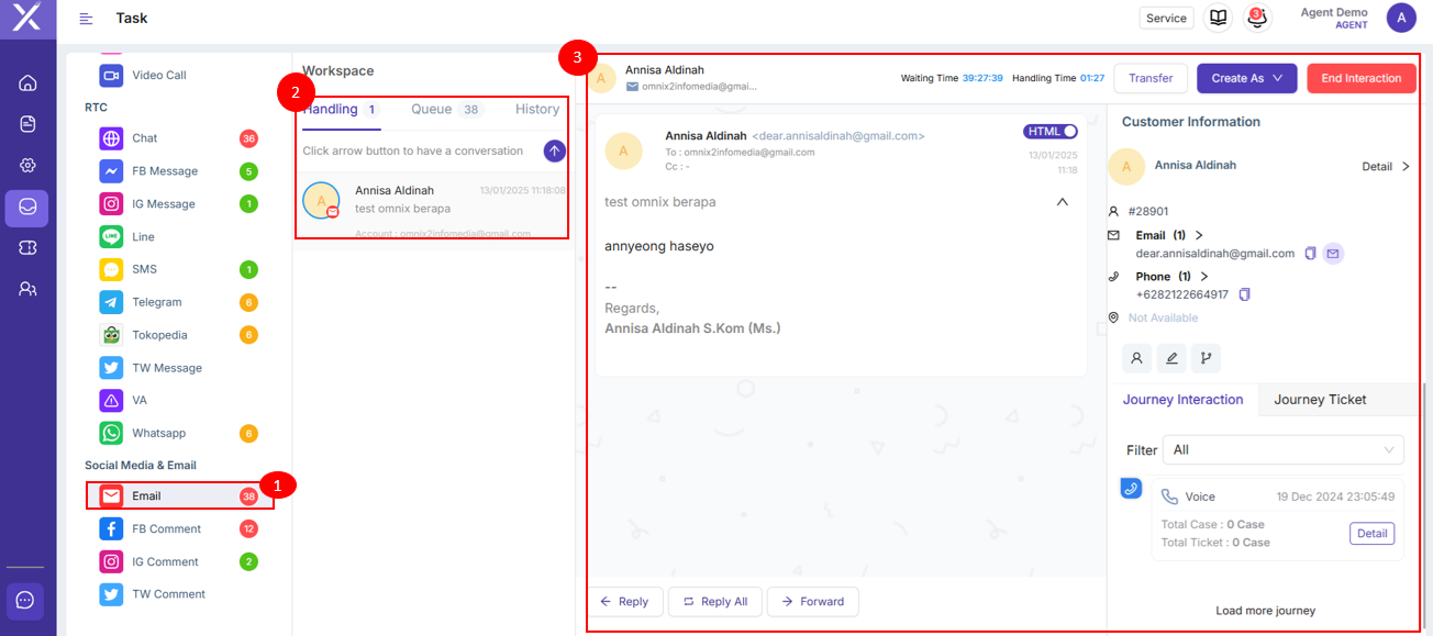 maka secara otomatis jumlah interaksi yang ada di kolom Queue akan berkurang dan di kolom Handling akan bertambah. Ketika klik salah satu interaksi yang ada, maka akan muncul tampilan seperti yang berada di sebelah kanan workspace.Dalam tampilan ini, terdapat Waiting Time dan Handling Time, kolom interaksi, informasi customer, journey interaction dan jorney ticket.