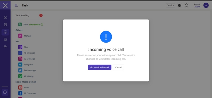 Agent menekan tombol "Go to voice channel" untuk menjawab panggilan dari telefon