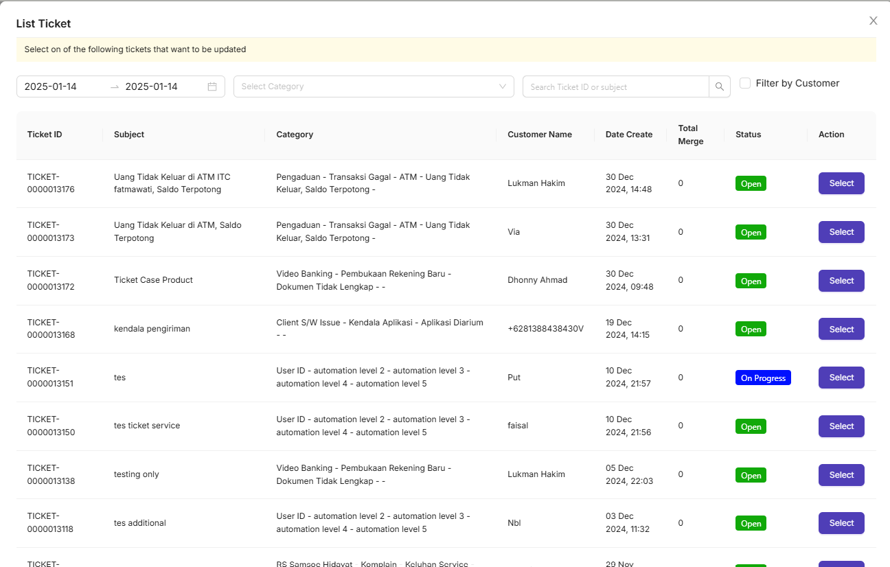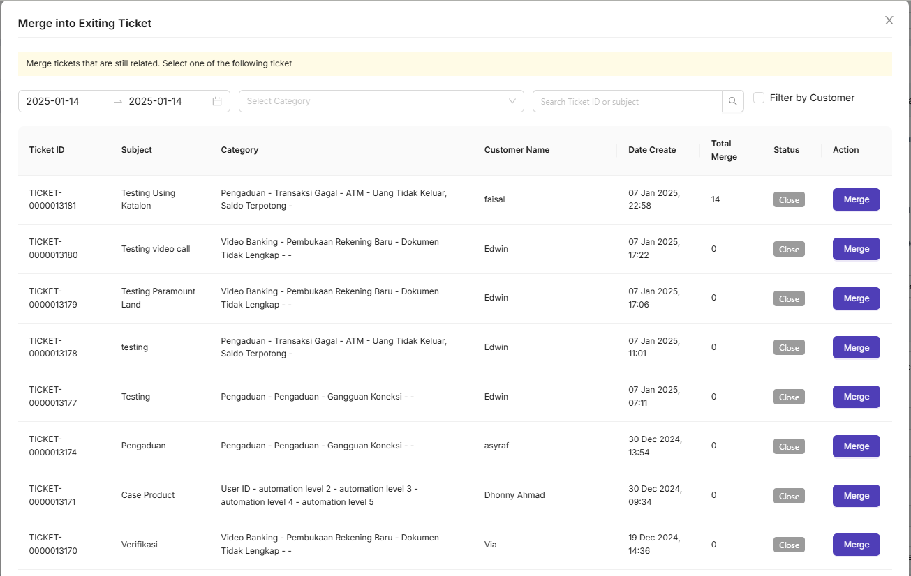 Setiap kali terdapat laporan interaksi yang serupa dengan pelanggan lain, Agent dapat menyamakan tiket atau kasus yang sudah ada dengan melakukan merge ticket. Proses ini dilakukan dengan memilih opsi 'Case Only' atau 'Create Ticket', kemudian melakukan merge ticket.