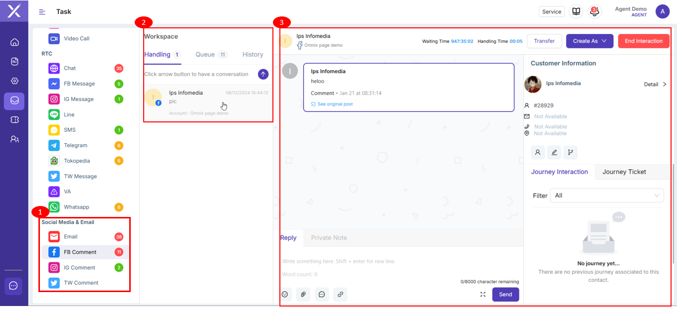 maka secara otomatis jumlah interaksi yang ada di kolom Queue akan berkurang dan di kolom Handling akan bertambah. Ketika klik salah satu interaksi yang ada, maka akan muncul tampilan seperti yang berada di sebelah kanan workspace.Dalam tampilan ini, terdapat Waiting Time dan Handling Time, kolom interaksi, informasi customer, journey interaction dan jorney ticket.